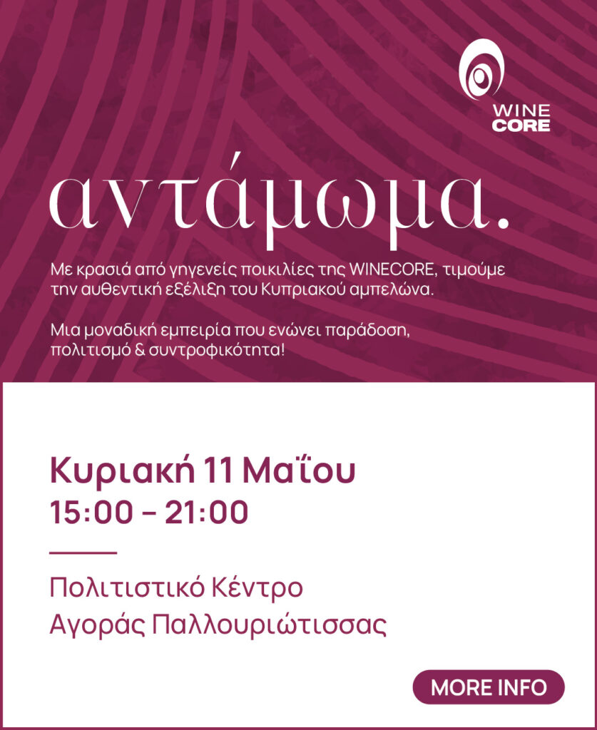 Η WINECORE – Cyprus Wine Consortium σας προσκαλεί στην 4η ετήσια έκθεση οίνου \”ΑΝΤΑΜΩΜΑ\”, η οποία θα πραγματοποιηθεί την Κυριακή 11 Μαΐου 2025, από τις 15:00 έως τις 21:00, στον Πολιτιστικό Χώρο – Παλαιά Αγορά Παλλουριώτισσας, στη Λευκωσία.