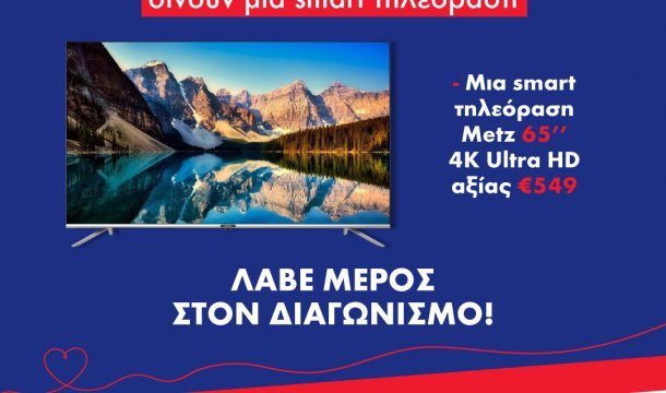 Το Ράδιο Πρώτο σε συνεργασία με την ηλεκτραγορά L.Papettas & Sons Ltd δίνουν την ευκαιρία σε ένα τυχερό να διεκδικήσει και να απολαύσει ένα δώρο υψηλής τεχνολογίας. Τον Άγιο Βαλεντίνο απόλαυσε μόνος ή με το ζευγάρι σου μια αξέχαστη τηλεοπτική εμπειρία μέσα από το μοναδικό δώρο του διαγωνισμού. Μια τηλεόραση Metz 65MUB7000 Smart 4K UHD […]