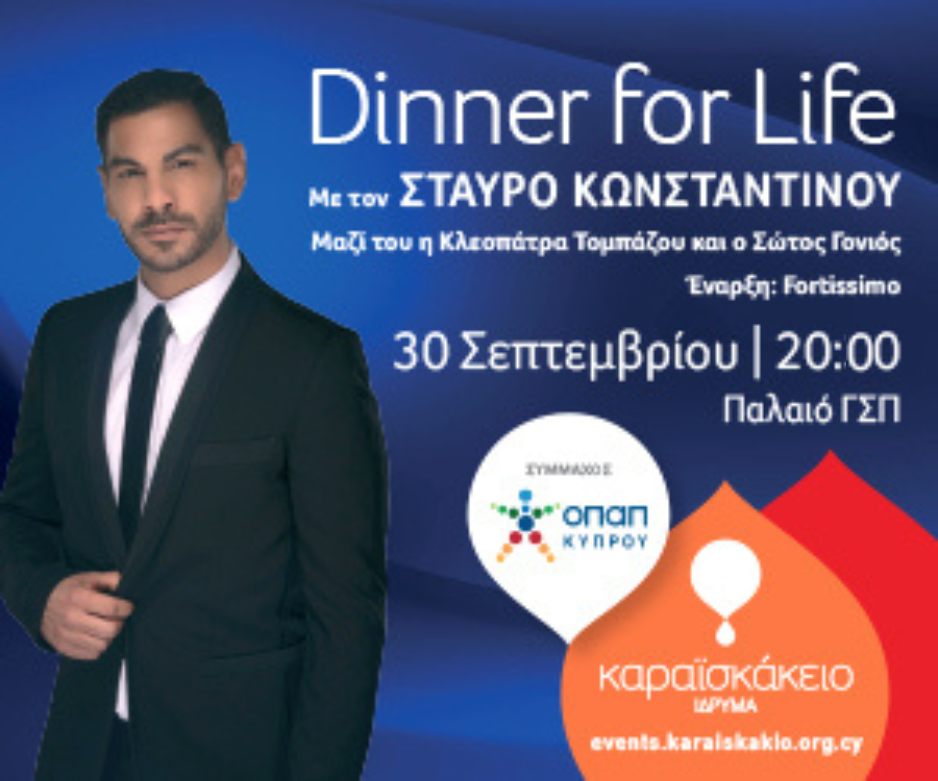 Tο Καραϊσκάκειο Ίδρυμα διοργανώνει και φέτος με αφορμή το Σεπτέμβριο μήνα Λευχαιμίας, την Τρίτη 30 Σεπτεμβρίου 2025, στις 20:00, στη Πλατεία του ανακαινισμένου Παλαιού ΓΣΠ, το Φιλανθρωπικό Δείπνο «Dinner for Life». Το δείπνο τελεί υπό την αιγίδα του εξοχότατου Προέδρου της Κυπριακής Δημοκρατίας κ. Νίκου Χριστοδουλίδη.