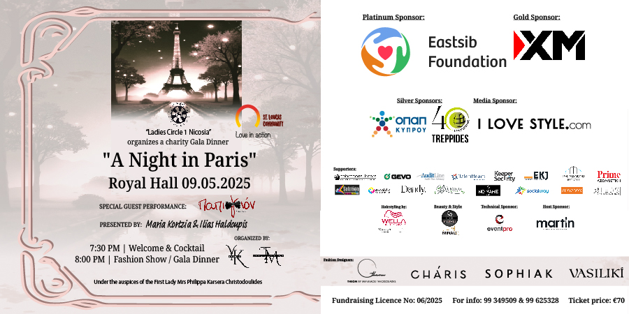 Την Παρασκευή 9 Μαΐου στηρίζουμε το εξαιρετικό έργο της Κοινότητας του Αγίου Λουκά του Ιατρού. Το Συμβούλιο και τα μέλη του σωματείου Ladies Circle 1 Λευκωσίας έχουν την τιμή να σας προσκαλέσουν στην ξεχωριστή φιλανθρωπική εκδήλωση A Night in Paris, η οποία θα πραγματοποιηθεί την Παρασκευή, 9 Μαΐου 2025, στο Royal Hall στις 19:30, υπό την αιγίδα της Πρώτης Κυρίας, κας Φιλίππας Καρσερά Χριστοδουλίδη.